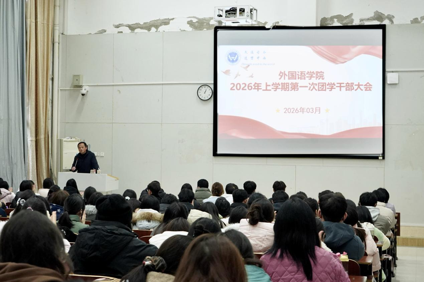 3月9日,伟德国际VICTOR1946在外语楼北110教室召开2026年新学期第一次团学干部大会。学院党总支书记周华、党总支副书记欧阳竹、学工办主任邱国周、辅导员曾超出席会议,第二十七届分团委学生会全体成员、2022-2025级班长团支书以及年级委员会成员参会,会议由欧阳竹主持。