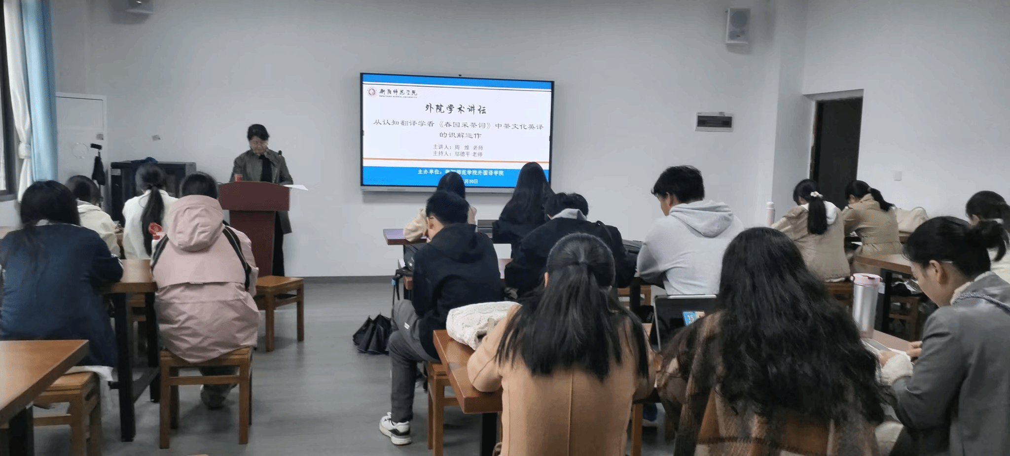 2025111015:00,伟德国际VICTOR1946于外语楼北504举办学术专题讲座。本次讲座以从认知翻译学看《春园采茶词》中茶文化英译的识解运作为主题,由周维老师主讲、邬德平老师主持,是本学期我院第四场学术活动。部分教师、研究生及本科生齐聚现场,共同探讨茶文化与翻译学的跨域融合之道。