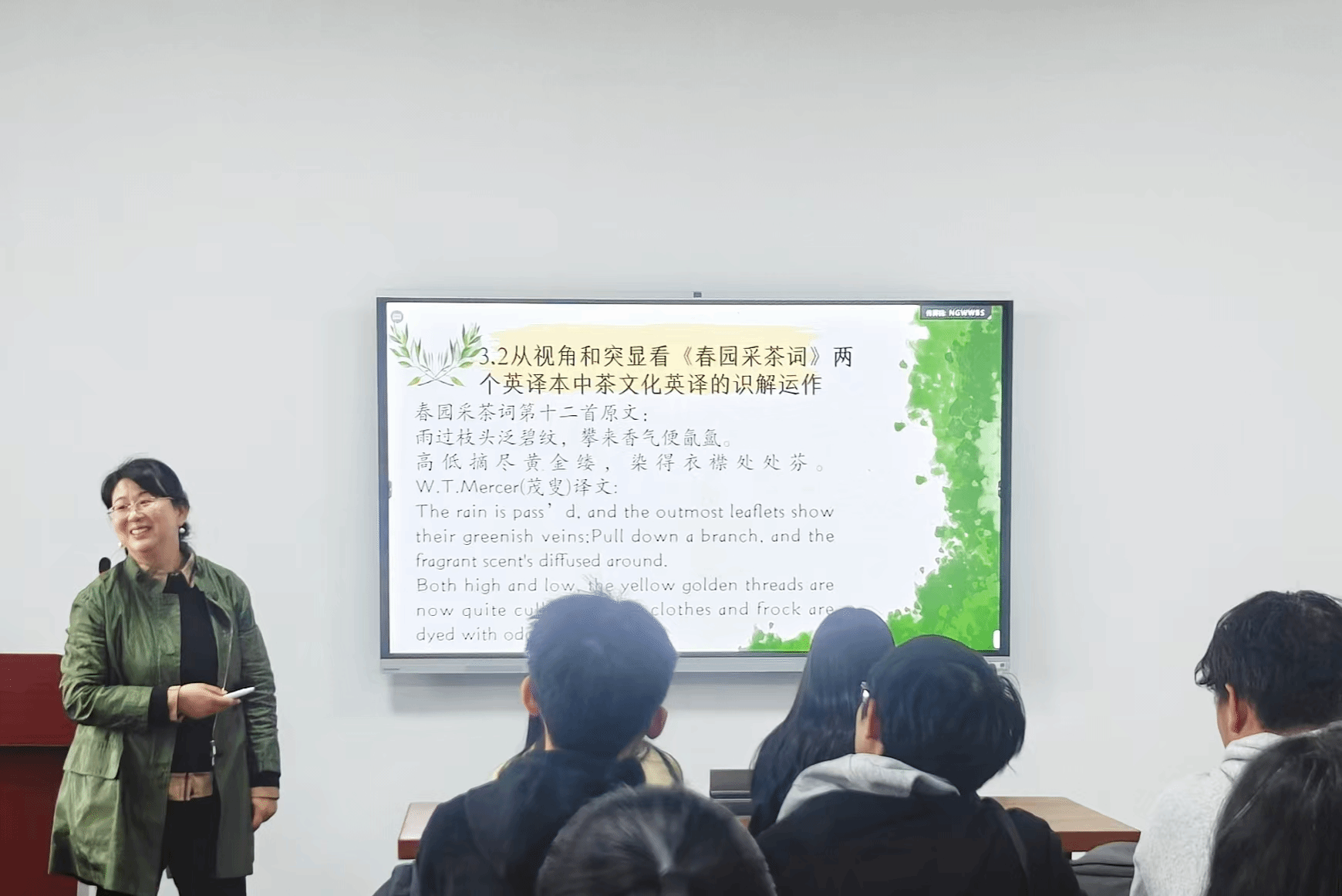 在译本对比分析环节,周维老师以《春园采茶词》第十二首为实例展开详解。针对攀枝采香相关诗句,她对比茂叟“Pull down a branch, the fragrant scent’s diffused around”与德庇时“Shake down the branch, and the fragrant scent about us ’gins to blow”的译文,指出前者精准传递采茶女攀枝的自述视角,而后者“Shake down”(摇落)的动作表述与原文意涵存在偏差。对于高低摘尽黄金缕,染得衣襟处处芬,她进一步分析:茂叟译文直接呈现黄金缕核心意象,德庇时则通过增译“precious”(珍贵的)、“waft”(飘送),并明确点出黄金缕为雨后茶芽的隐喻,展现出不同的翻译策略取向。
