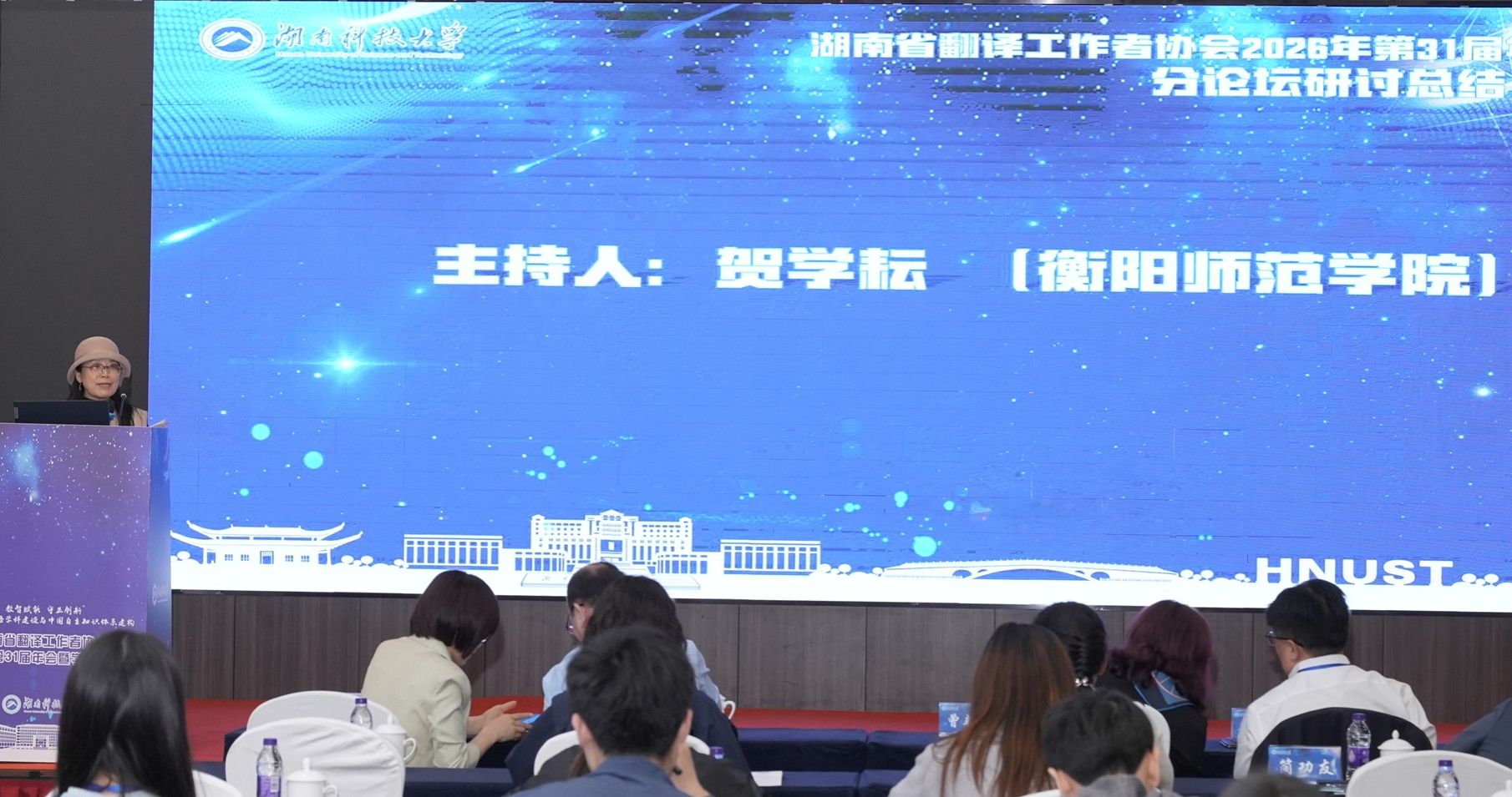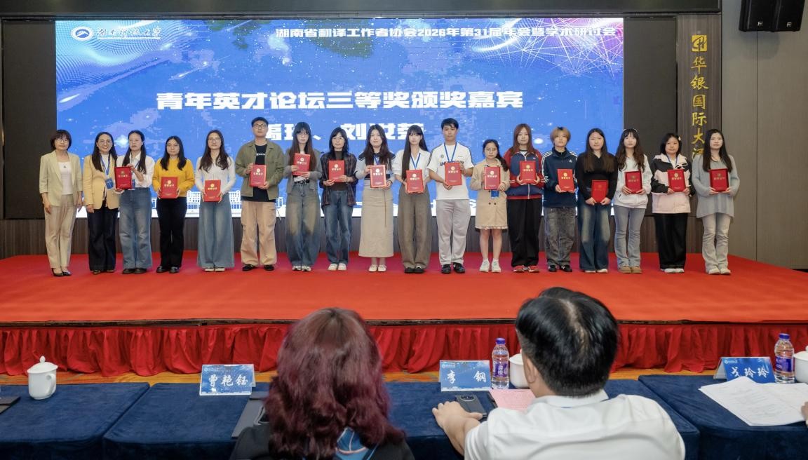 2026年4月11日至12日,湖南省翻译工作者协会第31届年会暨学术研讨会在湘潭市顺利举办。本次会议由湖南省翻译工作者协会主办、湖南科技大学承办,以“数智赋能 守正创新:新时代的外语学科建设与中国自主知识体系建构“为核心主题,吸引了全省各高校及相关机构300余名外语与翻译领域的专家学者、青年才俊齐聚一堂、共襄盛会。我院贺学耘教授、黄院丹博士、宁娜博士带领2023级研究生王超、徐洁、李攀、陈春媚、贺丽云,2024级研究生孙雪鸿、王君,2025级研究生陈艳、谢艾杉全程参会,深度参与大会各项议程,积极交流学习、凝聚行业共识。