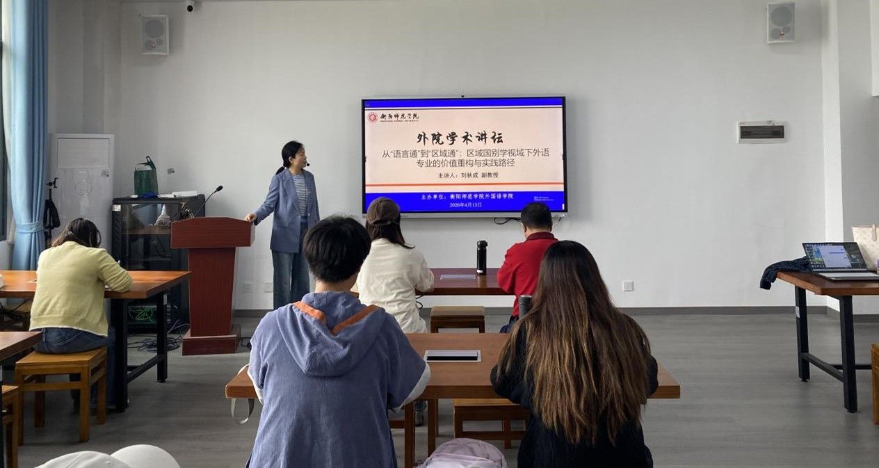 2026 年4 月 13 日下午 3 时,刘秋成副教授受邀在东校区外语楼北 504 教室,作题为《从 “语言通” 到 “区域通”:区域国别学视域下外语专业的价值重构与实践路径》的学术讲座。学院部分教师及2024级、2025级研究生到场聆听,共同研讨新时代外语学科转型发展的全新路径与发展方向。