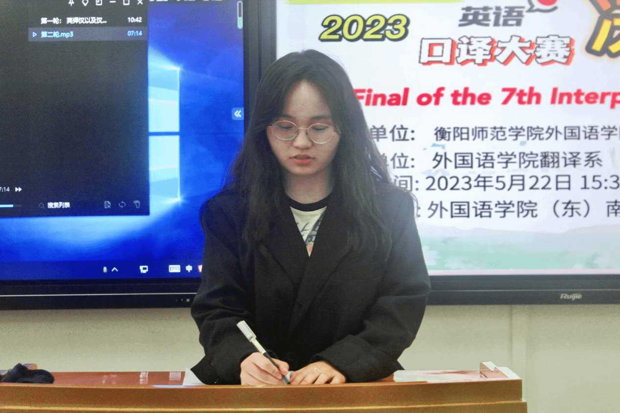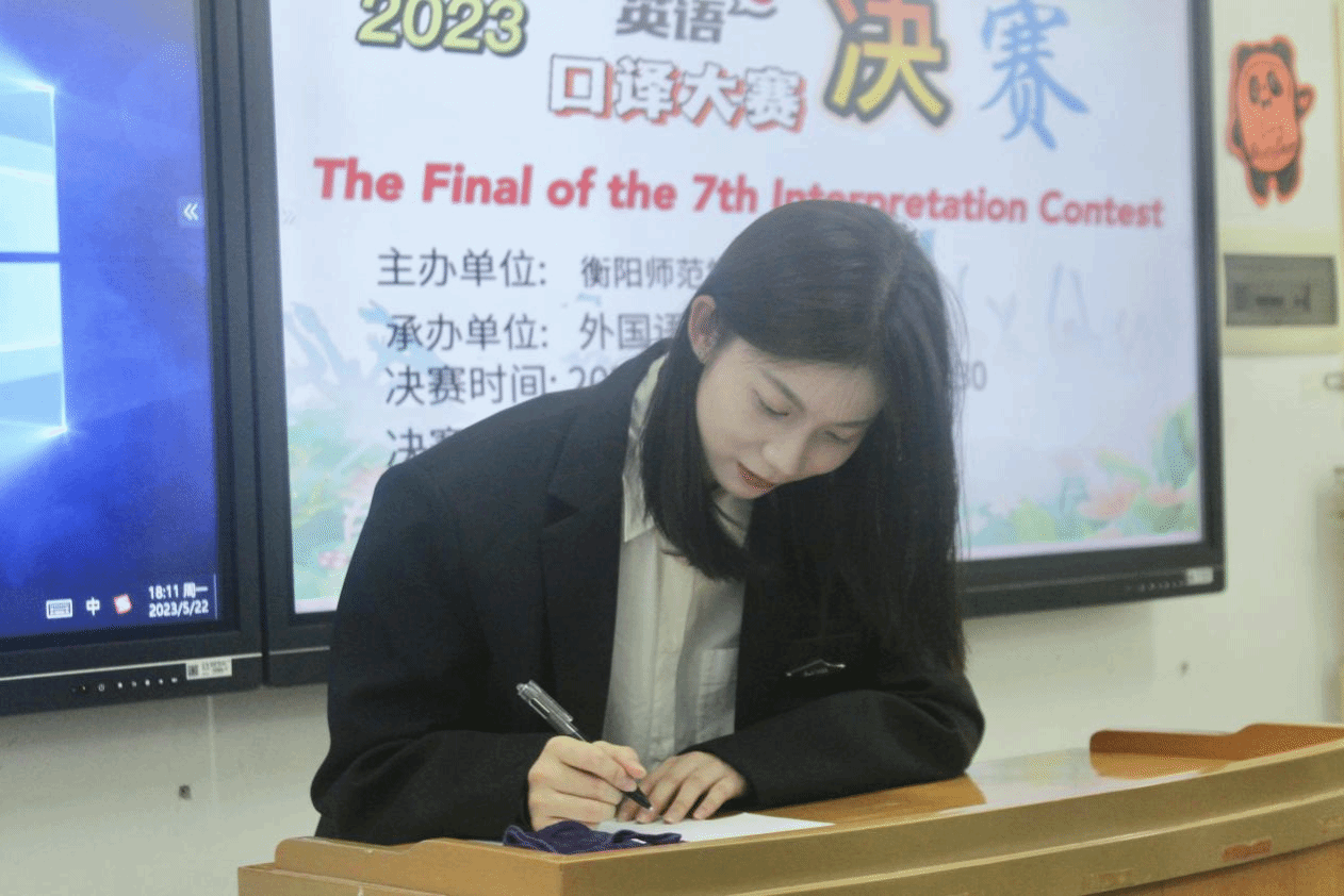 在第一轮比赛中,十位参赛选手聚精会神,笔尖沙沙,认真记录下听到的关键信息。他们时而皱眉思考,时而舒颜作答。优美的中文与英文声音此起彼伏,交织环绕着整间教室。从容不迫的回答里流露出他们缜密的逻辑,清晰的条理,以及流利的口语表达。经过第一轮比拼,五名选手成功晋级第二轮比赛。