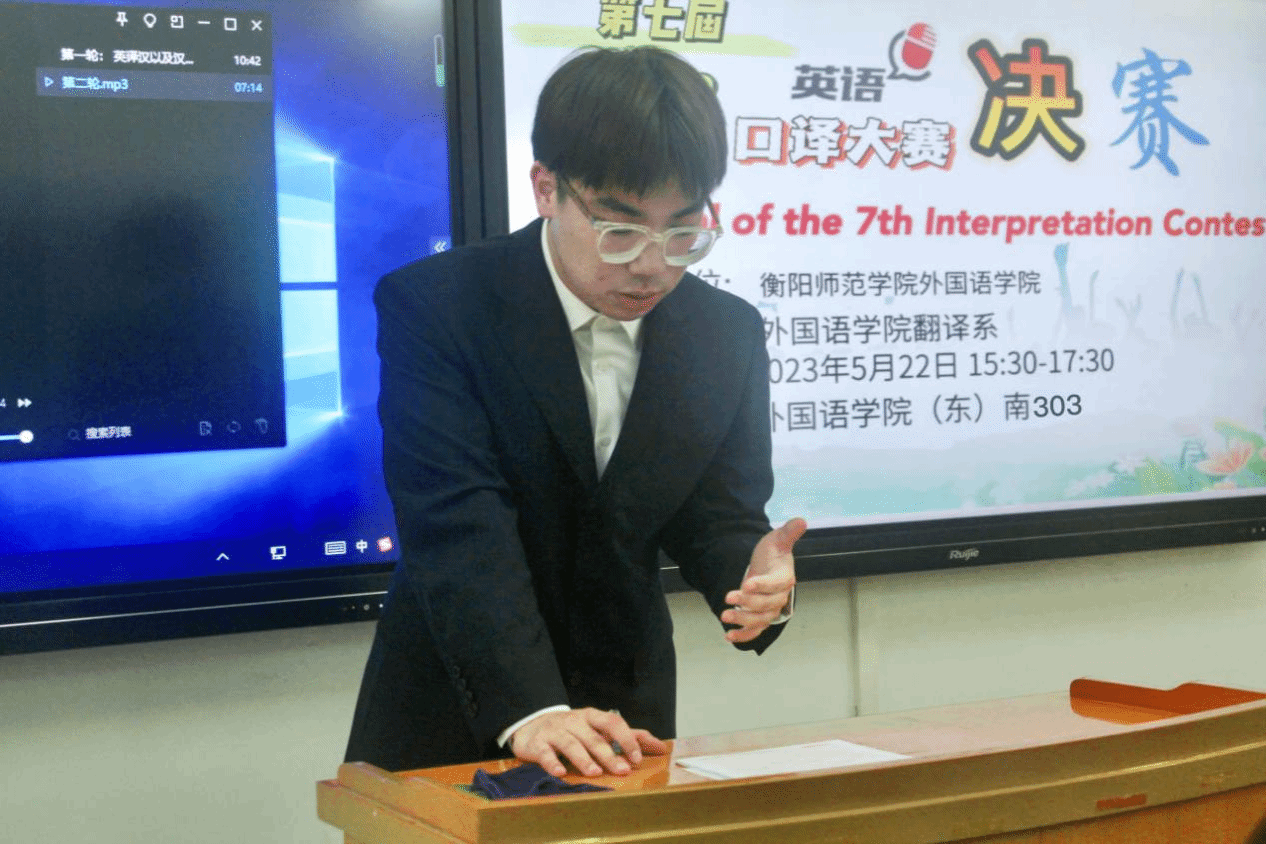 此次大赛共分两轮进行。第一轮为文章翻译,分英译汉与汉译英两部分,选手在录音播放时间内进行记录,录音播放完毕后即刻作答;第二轮为对话翻译,听力材料中讲话人分别用中文与英文进行对话,选手需依次为两位对话者进行汉英交替传译。