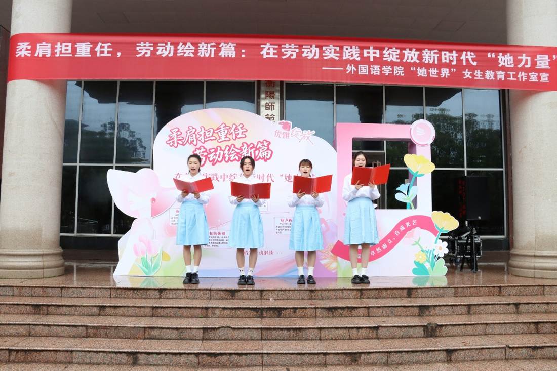 学生代表刘沐阳在发言中分享了她眼中的劳动与成长。她结合“她世界”平台与外语专业特色,分享了在志愿帮扶、文化传播中践行劳动精神的感悟,介绍了系列劳动实践活动,并倡议同学们以实干书写青春担当,让家国情怀在劳动中落地生根。