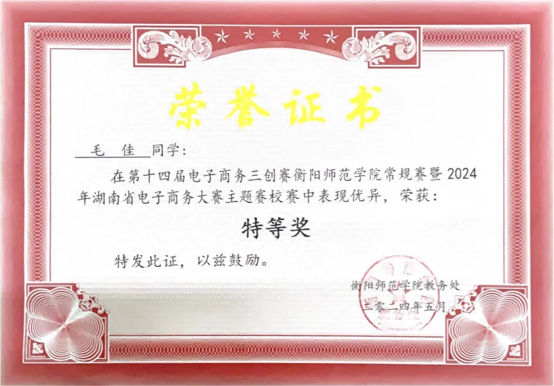 2023年获“亿学杯”商务英语实践技能大赛湖南赛区三等奖;