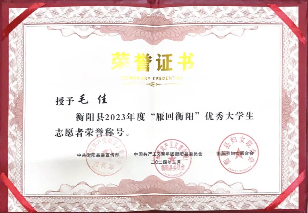 2024年获衡阳县“雁回衡阳”优秀大学生志愿者荣誉称号;