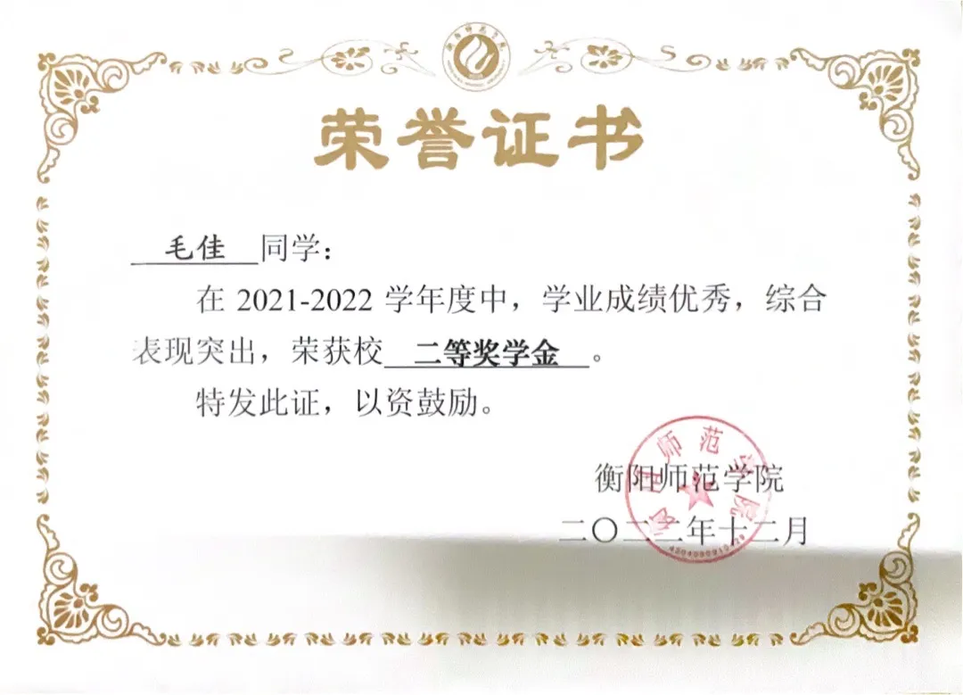 2022年获校级二等奖学金;