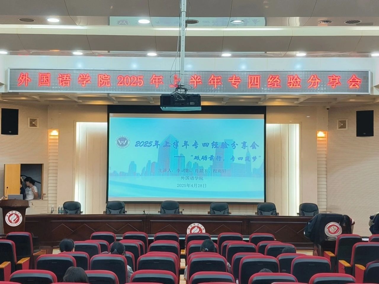 为助力英语专业学生科学备考英语专业四级考试,4月28日晚19:40-20:20,伟德国际VICTOR1946在北311教室举办“砥砺前行,专四筑梦”专四经验分享会。此次分享会邀请到在专四考试中成绩优异的李词影、肖显禾、程雨轩三位同学担任主讲,由学建部学生干部陈雨欣主持,为同学们传授备考策略、答题技巧与复习规划。