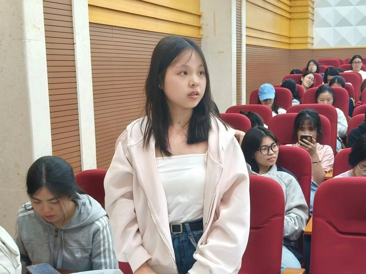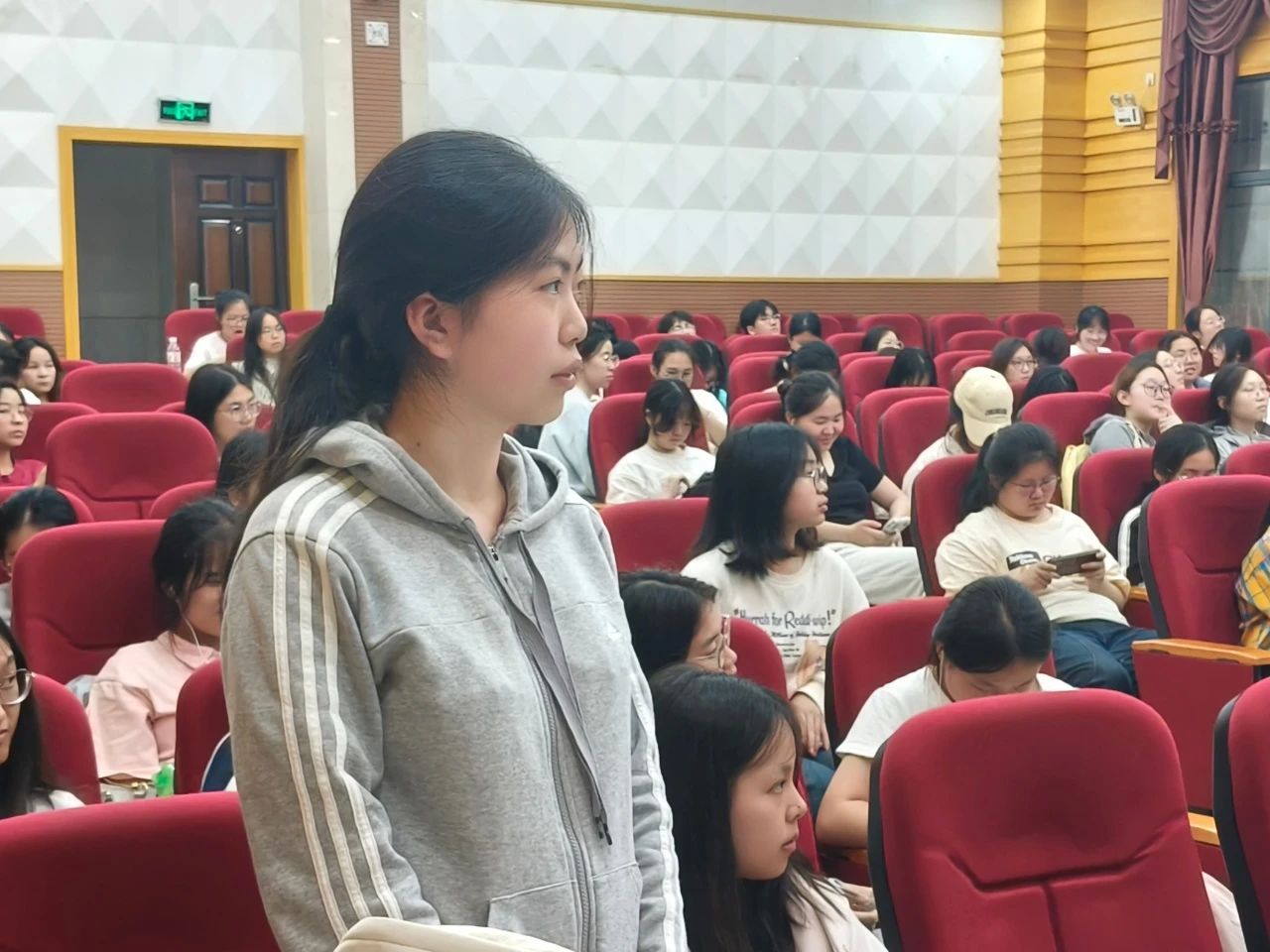然后,2022级英语八班李词影同学将备考划分为前、中、后三个阶段:前期采用“百词斩”与“A4纸记词法”结合的方式高效记忆词汇;中期聚焦薄弱环节,精研真题,详解听力评分准则与答题规范;后期着重把控做题节奏,钻研错题。她结合实例提醒同学们合理分配时间,避免因小失大。